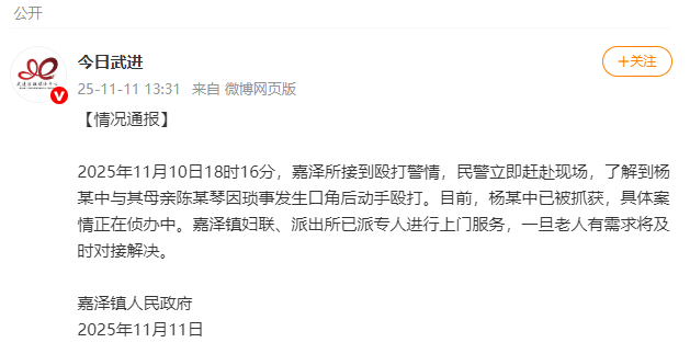 新京报11月11日,佳泽市人民政府发布情况通报:2025年11月10日18时16分,佳泽站接到袭警报告。民警立即赶到现场,得知杨木中与母亲陈木琴因小事发生争执,并对杨木中进行殴打。目前,杨木忠已被逮捕,具体事件正在调查中。佳泽市妇联、派出所均派出专职工作人员上门服务。如果前辈有需要,会及时联系。 11月10日,一段儿子殴打93岁母亲的视频出现在网络上。编辑 毛天宇