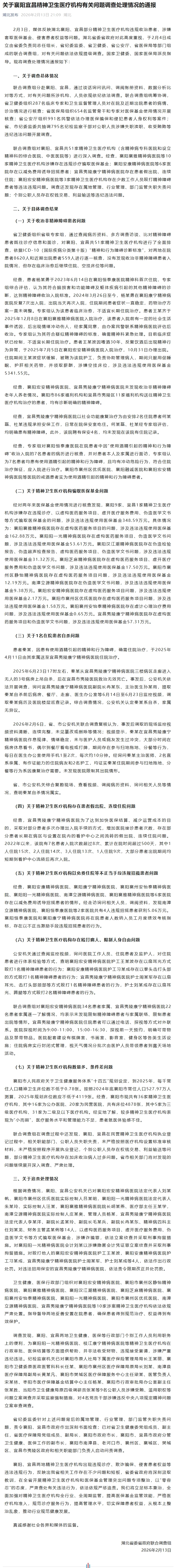 新京报讯 据湖北省官方微信公众号2月3日发布的消息,有媒体报道,湖北省襄阳市、宜昌市部分精神卫生医疗机构涉嫌非法收治患者、骗取医保金,侵犯患者权益。湖北省委、省政府对此高度重视。 2月4日,成立以省委负责同志为组长,省纪委、省卫生健康委、省公安厅、省医保办等部门组成的联合调查组,依法依规调查相关问题。国家卫生健康委、国家保险监督管理总局派出医疗官员前来指导。投资状况煽动和反应报告如下。 1、关于总体调查情况,联合调查组依法赴襄阳、宜昌,通过约谈、约谈、账簿资料、数据分析比对等方式,依法依纪依法对涉案机构和负责人进行调查。国家卫生健康委员会组织联合调查组,召集287名临床专家和卫生行政监督人员,对住院和近期出院患者的情况、诊疗情况进行排查。省医保办组织654名监管官员和专家对医保资金使用情况进行检查。州公安部组织991名警力依法查处医保诈骗和侵犯患者人身权利案件。省、市纪检监察组监察委共出动纪检监察人员795人次,对公务员涉嫌失职、受贿等违纪违法问题进行调查。联合调研组对襄阳市、宜昌市共51家精神卫生医疗机构(包括精神病医院、设有精神科的综合医院、中医医院等)进行了详细调查。经查,襄阳翔阿精神病医院等10家精神卫生机构涉嫌非法诊疗、骗取医保基金等行为。襄阳安康精神病医院等六家医院被迫降费招收病人。患者被误从宜昌市夷陵康宁精神病医院出院,目前仍在医院治疗。在三所精神卫生医疗机构中,我包括襄阳红安精神病医院在内,少数工作人员存在违法违规行为,包括殴打精神病患者等。调查还发现,属地管理、行业管理、部门监管等方面存在失职、失职问题。个别公职人员面临纪律和违法问题,包括权力和金钱交易以及利益转移。二、专项调查结果(一)无精神障碍患者治疗方面,省卫健委组织省级专家组对襄阳市、宜昌市共51家精神卫生医疗机构进行了全面排查,包括查阅病历、对各类人员进行调查访谈、对比既往诊疗信息、与精神障碍患者进行面对面会诊等。根据 ICD-10(在根据国际疾病分类第10版)《精神和行为障碍诊断标准》,对来自两个机构的8620名住院患者和559名近期出院的患者进行了检测。虽然无精神障碍患者住院,但存在临床康复后继续住院、床位供应等问题。调查结果,患者杨木勇于2023年6月14日首次住进太钢襄阳恒医院精神科。专家组对患者进行了全面评估,确定其符合因躯体疾病导致脑损伤、功能障碍等精神障碍的诊断,符合精神障碍住院标准。 2024年3月26日至今,杨武英一直住进襄阳市康宁精神病院。他曾七次住院并再次入院出院当天。患者住院期间症状保持稳定,未对其药物治疗方案进行调整。专家组认为,患者临床已治愈,不适合长期住院。患者王某奇于2025年12月8日入住襄阳市仙亚精神病医院。患者入院前经历了特定的社会生活事件,之后产生了伤害他人的情绪冲动。经家属同意,办案民警联系精神病医院进行评估后收治了他。专家组认为,他符合疑似精神障碍的标准,实际上需要紧急精神治疗。目前临床症状已得到控制,患者不适合长期住院。患者王梦波酗酒30年,身体出现异常因多次饮酒后出现行为异常,于2025年7月5日住进襄阳红安精神病医院治疗。10月31日,王某波出院。住院期间,因症状好转,被聘为医院护士,帮助治疗患者。在此期间,他只吃促进睡眠和保肝的药物并领取工资。他被指控腾空床位并冒用医保基金5341.55元。襄阳市红安精神病院和宜昌以岭康宁精神病院调查发现,没有发现无精神障碍老年人被定点养老的案例。襄阳市86家福利院 宜昌市夷陵区11家福利院送精神卫生机构治疗的患者全部被明确诊断为精神障碍。调查结果显示,宜昌市以岭康宁精神病医院违反规定,为住院患者何茉蕾、杜某提供保安服务,每日在医院保安室吃住,以治疗恢复社会功能为目的,违规。他和杜某经专家组诊断,均患有明显的精神障碍。此外,医院内有4名保安驻守,院内未发现任何住院记录。经调查,专家组查阅了襄阳恒太港医院收治的7名“因饮酒导致精神行为障碍”患者的病历,并采访了患者及其家属。专家组认为,7名患者均患有饮酒引起的精神和行为障碍,且均有冲动、危险行为。他们符合住院指征,需要入院接受治疗。酒精襄阳市仙州区友福医院、襄阳荣成医院、襄阳红安精神病医院等医院收治的酒精患者,实际上都是因饮酒导致精神和行为障碍的患者。 (二)关于精神科医疗机构诈骗医保问题。近两年医保资金使用情况调查显示,襄阳市9家精神卫生医疗机构、宜昌市1家精神卫生医疗机构涉嫌非法诊疗、虚构医疗服务、虚报医疗费用、伪造医疗凭证等涉及冒用医保资金348.59万元。具体情况是,襄阳湘雅精神病医院存在虚构医疗服务、冒用医保资金162.8万元等问题。襄阳雅精神病医院凌一光介绍,存在冒用医保基金53.61万元、虚构医疗服务项目、伪造医疗证件等问题。襄阳邗江潮精神病医院存在虚假检查报告、虚假超声检查报告、虚假医疗服务项目、冒用医保基金等虚假医疗证明等问题3。 13200元。襄阳紫马精神病医院存在冒用医保基金17.5万元、虚构医疗服务项目、虚假医疗费用、伪造医疗证件等问题。在襄阳市象州区精益精神病医院,一家虚构医疗服务公司骗取医保资金12.19万元的问题已成问题。南漳梨园精神病医院已