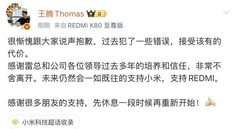 北京新闻Beike Finance(Chen Wai Chen Reporter)是一位北京新闻纽约市的财务记者,他从几个独立的来源中获悉,小米集团发了一封内部电子邮件,该公司决定向中国市场总经理和Redmi品牌总经理Wang Teng说再见。在当晚的最后一刻,王十道歉:“我过去犯了一些错误,接受了价格。让我们休息一下,重新开始。” 9月8日,小米集团的职业伦理委员会发出了一封内部电子邮件,告知解决王的法规和违反纪律的情况。中国市场部雇员王滕(Wang Teng)泄露了有关公司的机密信息,并在法规和利益冲突等领域遭受了严重侵犯。根据“处理小米集团雇员的法规和部门违反部门的措施”和“小米集团的综合CODEAD和完整性,“该公司已决定解雇WangTeng。WangTeng Certification的Weibo的信息说,Wang Teng已被任命为中国市场营销总经理和Redmi Brand的总经理。它占据了21年的职位,并且是中层的行政管理主管。当晚,王十字会说:“我对全部感到遗憾。我为过去犯了一些错误而感到ham愧,并接受了它应该基于的价格。