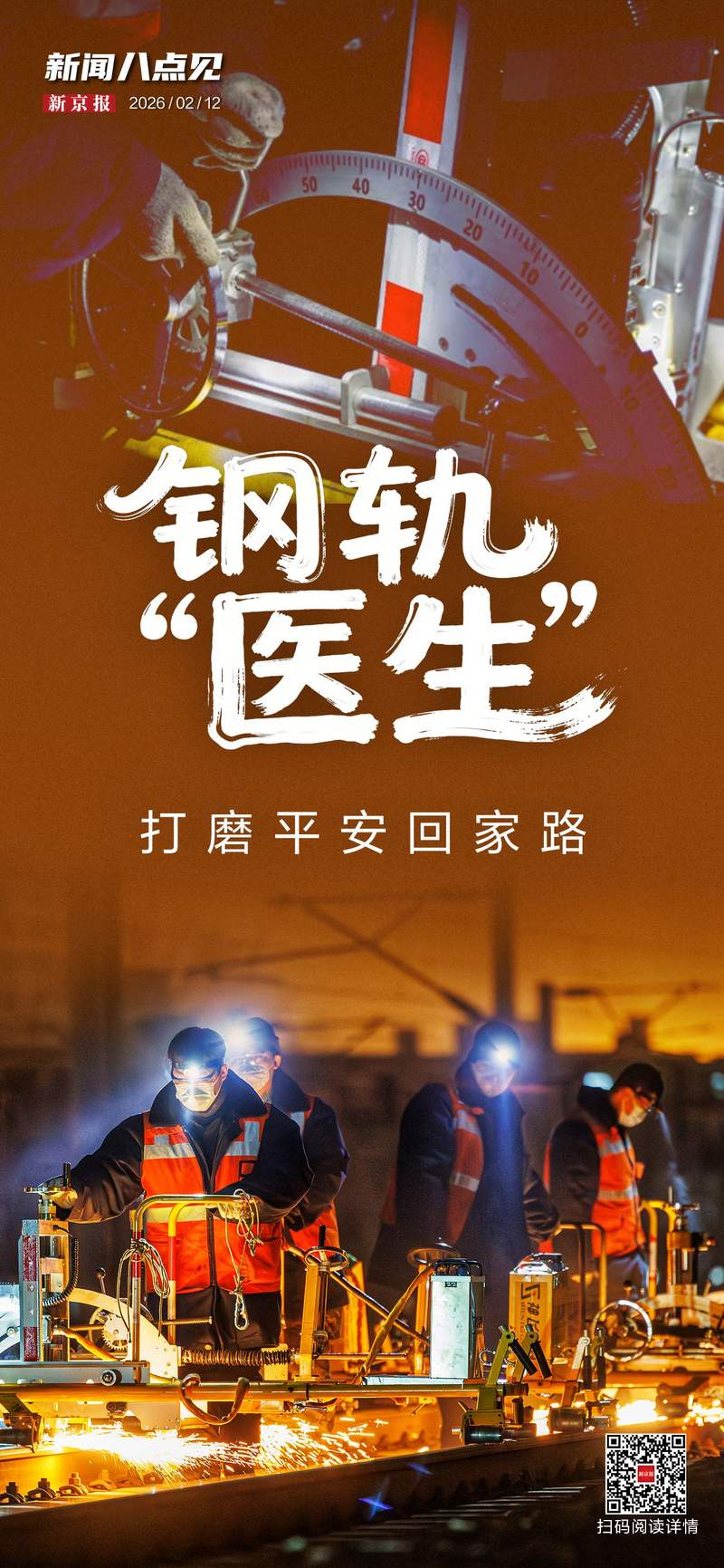 请于 8 点加入我们,了解新闻和更多信息。每天早晚8点准时见面,看世界之大。 2月10日凌晨,当城市沉睡时,北京南站8名“2000年代”的铁路工人穿着橙色反光防护服。每人推着一台重达200多公斤的破碎机。与铁轨的碰撞产生了一连串金红色的火花,就像深夜铁轨上绽放的“钢焊花”。 2月10日一早,北京南站的工人们正推着打磨机将铁轨修整至“毫米级”。国家铁路局高铁建设部廊坊高铁线路车间北京南检修工区的工人只能在中午12点30分的“阳光时段”进行作业。至凌晨 4:30目前,高铁线路暂时关闭d、禁止火车通过。北京南检修工区负责北京南站城际及高速公路车场共计75台开关柜和38公里轨道的检修工作。过年期间,列车运行密度增加,可用于高铁抢修的“天窗”数量减少。因此,工人们花费大量时间维护和修理铁轨,使铁轨保持良好状态,让铁路旅客能够安心地迎接新年的钟声。轨道的平稳性直接影响列车的稳定性和安全性。这支年轻人团队将负责“铁路治疗”,其中包括使用仪器检查铁轨并修复因铁轨密集使用而造成的缺陷。这些缺陷很难用肉眼识别。 2月10日零时30分,工人们抵达施工现场准时。他们今天的主要工作是用小型机械对北京南站城际站场沿线718米至838米的0公里路段进行打磨。这些年轻人把重达200多公斤的磨床抬过铁轨,推到了现场。用小型机械进行打磨工作的目的是为了消除因频繁使用钢轨而引起的铁路病害。当钢轨出现鱼鳞或波纹磨损等病害时,钢轨碎片会脱落,影响列车运行感觉。这是一种小型机器打磨作业,用于去除钢轨上的病害。用手推着磨床的李一伟看着砂轮与钢轨的接触处,火花四溅。致力于抛光工作3年半,经验丰富,一直在积累。 “良好的抛光效果取决于感觉。你必须精确控制力量和速度。这就是极致的工艺在他的双手之下,因长长的火车滚动而留下的细密花纹的铁轨表面,又恢复了镜面般的光滑。打磨完毕后,技术人员用电子轮廓仪对曲线进行检测,屏幕上的配速曲线逐渐接近标准轮廓模板。了解更多>>> 随着春节前出行高峰的临近,京广、京沪、京哈等高铁夜行列车陆续开行。不少旅客利用候补购票的机会,利用了高铁的夜间加班服务。针对节前旅客量持续增加的情况,2月12日,北京国家铁路局有效调整运力,开行高速夜车68列、高速夜车9列,主要发往沉阳、长春、大连、青岛、郑州、西安等热门目的地。深圳、广州、太原等地,满足旅客出行需求。乘客。 2月1日午夜,高铁夜班G4375次在北京西站几乎满座。 2月12日一早,北京报记者王桂斌拍下了北京西站的照片。白天,车水马龙。为了让更多旅客安全回家,凌晨平均每30分钟增开一趟夜间高速旅客列车。这种喧嚣一直持续到凌晨两三点。火车目的地包括郑州、武汉和西安。车站、列车正在做好各项准备工作,为旅客提供更加细致的服务。 “我以前一直买不到白天的高铁票,所以我决定先等一等,并成功买到了夜间的高铁票,我只想回家。”上午 11 点 20 分2月11日,乘客刘某在北京西站候车车站。 11日深夜,我搭乘夜间高铁G4375次航班,返回河南郑州过年。已经是凌晨 2 点 30 分了。 12日抵达郑州。苏先生也乘坐G4375次列车,返回河南老家。目的地是较远的新阳东站。她于12日凌晨3点47分抵达。她给家里的父母带来了北京稻香村的糕点和紫光园恩多姿酸奶。 “我盼了一年的农历新年终于到了,我来的比较晚,幸好家人来车站接我。”特快列车上的苏说。他说,他意识到得早,并尽快拿到了车票。阅读全文 >>> 马云过年,北京蔡过年。北京一键为你准备好过年的感觉。新京报为您带来一份个性化的寺庙之城必去景点清单,浓缩北京年味精髓。二十庙庙会包含 20 种您不容错过的体验。保留这张北京年庙城地图。点击查看签到点 >>> 这是一个在线中继。正森从方言中辨认出了老人的家乡,志愿者金健将寻家视频发送到网上,指出了老人家乡所在的州、市。一位失踪25年的老人借助互联网在24小时内找到了家。经成功寻找家人,老人的小儿子被福州市救助站接回家。受访者提供的视频显示,一名白发、衣衫破旧的无家可归老人。他重复了几个模糊的音节:“大涛”和“大洪文”。当你问他家在哪里时,他会嘟哝“猫-Ahiru-sama”或““祖玛亚。”这种模糊的乡音成为他与过去世界唯一的微弱联系。2025年底,这位无家可归的老人在福州连江县的街头被发现,谁知道几天后她就离开数千公里回到家,说着一些听不懂的音节。破解方言密码的是郑森。二十年来,他的兴趣让他积累了大量的方言素材。研究音韵学,用程序员的思维,把方言当成一组可以分解和比较的“声学参数” 阅读全文 >>> 北京时间2月12日上午,米兰冬奥会结束了男子1000米速滑项目的铜牌,这也是中国运动员首次在这项赛事中获得奥运奖牌。 1000米速滑决赛在意大利米兰举行 米兰-科尔蒂冬奥奥运会。中国选手宁忠岩获得铜牌。新华社记者 李静米 供图 拉诺冬奥会15组运动员将参加1000米速滑比赛。宁中岩从第12组出发。作为本届冬奥会中国代表团开幕式的旗手之一,宁中岩的表现引起了大家的关注。最终,宁中岩滑行成绩为1分07.34秒,这是他个人在平道上的最好成绩。 “我真的不敢相信我能滑得这么好。”宁中岩表示,赛前他并没有想太多,只是给了自己一个心理线索:“相信自己。”经过北京冬奥会的训练,宁中岩进步